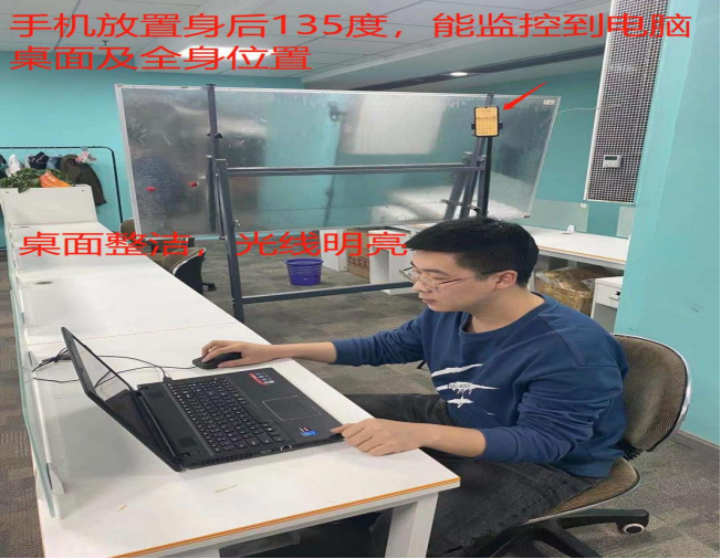 (二)考试形式。本次考试为在线考试,双摄像头监控,考试系统和手机腾讯会议实时监控。考生须提前30分钟架设好手机(环境监测设备),用手机登陆腾讯会议客户端,务必修改设备名称为自己真实姓名,进入在线笔试考场候考。在正式笔试前15分钟,监考人员将通过腾讯会议语音的方式宣读考场纪律,考生需在临考前30分钟进入腾讯会议间,并确保自己手机麦克风和声音处于关闭状态,考试全程务必保持手机处于WIFI连接模式且仅打开使用腾讯会议APP,因电话或其他原因造成视频中断超过5分钟,笔试成绩无效。视频开启后,将手机放置跟试测时一样的位置即可(大概在自己侧后方位135度)。登陆系统后,在PC端登录考试系统,填写基本信息,进行身份验证,等候开考,考试开始后,进入实时监控阶段。