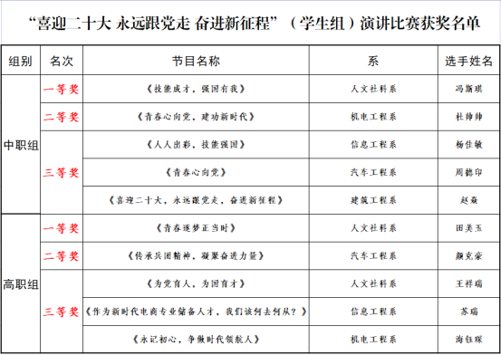 经过激烈的角逐,评选出了中、高职组一等奖各1名、二等奖各1名、三等奖各3名,现场向获奖选手颁发了荣誉证书及奖品。