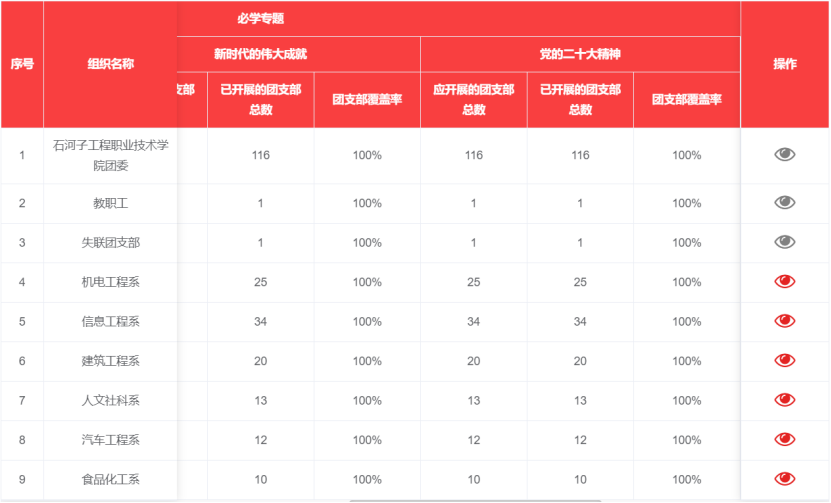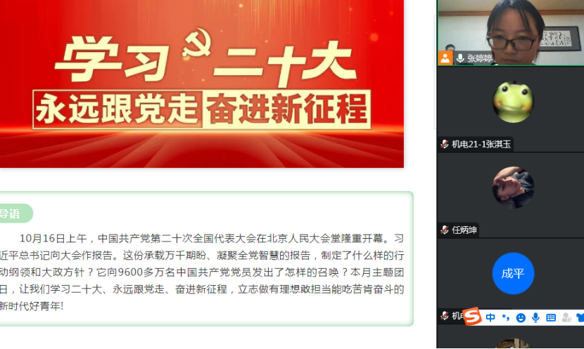 2026世界杯官方合作网站团委通过发布《学习二十大、永远跟党走、奋进新征程》统一讲稿和课件,组织全院116个团支部,通过主题团课,带领支部团员青年将二十大精神学习感悟,实现“院-系-班”三级团员青年全覆盖,推动学习宣传不断走深走实,实现团支部覆盖率100%。